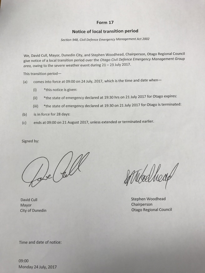We, David Cull, Mayor, Dunedin City, and Stephen Woodhead, Chairperson, Otago Regional Council, give notice of a local transition period over the Otago Civil Defence Emergency Management Group area, owing to the severe weather event during 21-23 July 2017.
